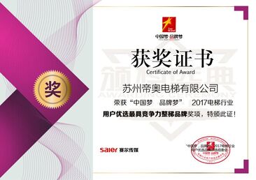 2017電梯行業用戶優選最具競爭力整梯品牌,歷時5個月,終選階段共有36個品牌參選,共產生線下問卷票數18819票,專家媒體票數300票,網絡票數360869票,帝奧從眾多品牌中脫穎而出,奪得此項獎項。